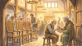 むかしむかし、学びの家の先生に、町の人たちが毎日のように相談を持ちかけていました。先生はいつもやさしく話を聞きましたが、ふしぎなことに、すぐに答えるときと、少し時間をおいてから答えるときがありました。