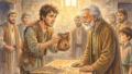 数日後、今度は村の子どもたちが同じ橋で止まってしまいました。魚のかごを持った子と、薪を運ぶ子が向かい合い、どちらも先へ行きたがったのです。すると近くにいたあの男が笑って声をかけました。